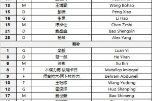 U23国足对阵越南首发:16-李昊、2-胡荷韬、4-吾米提江、5-刘浩帆、15-彭啸、23-杨希、21-鲍盛鑫、13-王博豪18-陈泽仕、7-向余望、11-蒯纪闻