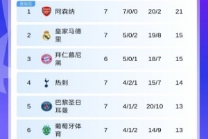 欧冠第7轮首日积分:枪手全胜!皇马暂升第2 曼城跌第7国米跌第9