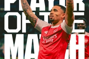 梅开二度!热苏斯被球迷评为阿森纳3-1国际米兰队内全场最佳