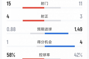 利物浦3-0马赛全场数据:射门11-15,射正3-4,得分机会4-1