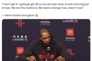 赛后,美媒Hoop Quotes晒出了杜兰特的赛后采访,他说道:“我不明白。我必须拿到35分才能勉强保持比赛的悬念,结果还是输球。我们不应该这么平庸。我们需要改变,现在就需要。哦不,我得去做我的工作了。无论输赢,我还是能拿到数百万的报酬。”