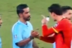 赛后,有球迷拍到,拜合拉木与主裁握手时指着他鼻子说了两句,离开后还在说,黄博文摸头安抚。