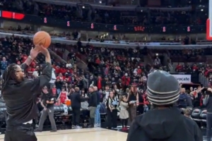 久违了!德里克·罗斯赛前与小球迷一起热身 底角三分出手就有