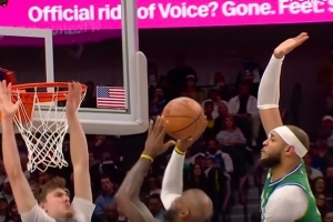 黄雀在后!加福德奋力补防 送詹姆斯排球大帽