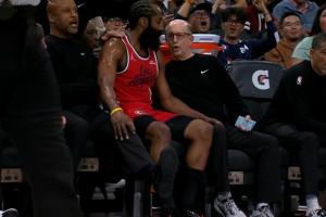 哈哈!哈登经典双撤步3+1 随后直接坐在小范甘迪旁边吹NB