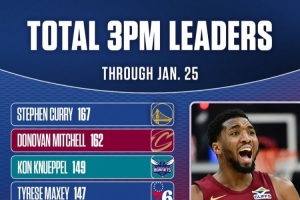 三分命中数总榜!库里/米切尔稳居前二 克尼佩尔暂列第三