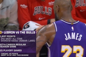詹姆斯生涯常规&季后赛共战公牛88场:总得分1837分仅次于贾巴尔