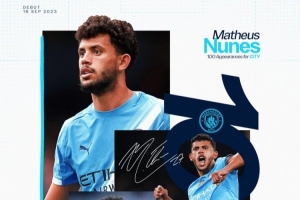 努内斯曼城生涯百场里程碑,此前99场5球21助攻获3冠