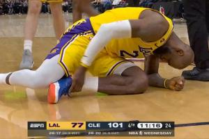 还好没大事!詹姆斯落地踩到球哥的脚 倒地捂着左脚踝!