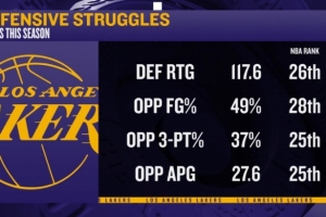 四处漏风!媒体总结湖人本赛季多项防守数据均位列联盟末流