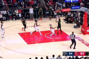 黄雀在后!詹姆斯奋力追防 高高跃起送阿巴基钉板大帽