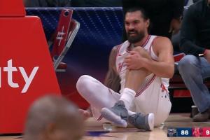 不要啊!亚当斯防守落地左腿受伤了 起不来啊 被搀扶回更衣室