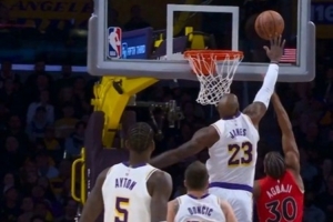 黄雀在后!詹姆斯奋力追防 高高跃起送阿巴基钉板大帽