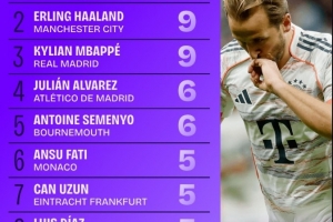 24直播网讯 欧洲五大联赛射手榜更新,凯恩以11球领跑,哈兰德与姆巴佩同以9球并列第二。阿尔瓦雷斯、塞梅尼奥以6球紧随其后,法蒂等五人则以5球并列第五。