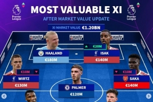 24直播网讯 德转会10月17日更新英超球员身价,并公布了身价最贵阵。该阵总身价高达12亿欧元,包含哈兰德(1.8亿欧)、维尔茨(1.3亿欧)、伊萨克(1.4亿欧)等球星。阿森纳球员占据半数席位,赖斯与萨卡分列中场与前锋身价榜首。