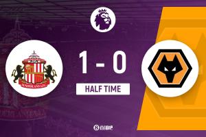 半场-穆基勒精彩撞墙配合破门狼队0射正 桑德兰1-0领先狼队