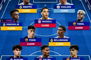 24直播网讯 德转盘点了足坛身价最高的11人阵容,总身价高达14.5亿欧元。其中,巴萨小将亚马尔以2亿欧元的身价位居榜首。皇马的贝林厄姆、姆巴佩以及曼城的哈兰德均以1.8亿欧元的身价并列。