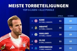24直播网讯 根据《转会市场》统计,本赛季五大联赛球员参与进球榜出炉。凯恩以11场22球(19球3助)高居榜首,姆巴佩(17球)与哈兰德(15球)分列二、三位。奥利塞、格林伍德等球员也跻身前十。
