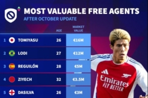 自由球员身价排名:富安健洋1600万欧领跑,雷吉隆、齐耶赫在列