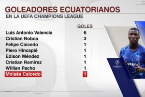 24直播网讯 切尔西欧冠5-1大胜阿贾克斯,凯塞多首发出战并打入处子球。此球使他成为第8位在欧冠进球的厄瓜多尔球员,目前厄瓜多尔球员欧冠总进球数为14球。