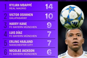 24直播网讯 欧冠前三轮射正榜,姆巴佩以14次射正高居榜首,奥斯梅恩(10次)和凯恩(9次)分列二、三位。哈兰德等名将亦跻身前十。