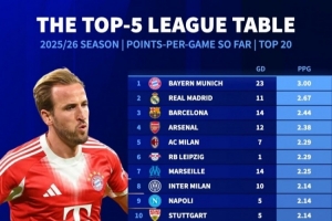 24直播网讯 根据《转会市场》统计,本赛季五大联赛场均拿分榜出炉。拜仁慕尼黑以3.00分高居榜首,皇马(2.67分)、巴萨(2.44分)和阿森纳(2.38分)分列二至四位。曼城以2.00分排名第13,利物浦仅列第19位。