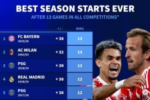 24直播网讯 拜仁德甲3-0完胜门兴,赛季开局豪取13连胜,追平米兰五大联赛最佳开局纪录。德转统计显示,拜仁2025/26赛季以13胜、+38净胜球的强势表现,位列五大联赛单赛季前13场最佳开局历史榜首。