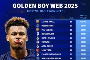 24直播网讯 2025年金童奖候选名单公布,巴萨新星亚马尔以2亿欧元的身价高居榜首。这份榜单汇聚了足坛众多年轻才俊,包括巴黎的杜埃、库巴西,以及皇马、曼联、阿森纳等豪门的新秀。这些身价不菲的年轻球员,代表了世界足坛的未来与希望。